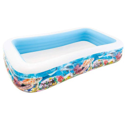 Басейн 58485 має прямокутну форму і оснащений двома відсіками. Він може стати прекрасним доповненням вашої дачі або відпочинку на природі. Кожен з них має вхідний і вихідний клапан. У ньому можна покупатися, пострибати, повеселитися і не варто переживати, що він лопне або ж діти травмуються. Дитячий басейн легко витримує навантаження від ударів і розтягувань. Він стійкий до дії ультрафіолету. Його стіни виготовлені з високоякісного щільного полівінілхлориду, який стійкий до різного роду навантаження. У комплекті є набір для термінового ремонту проколів.