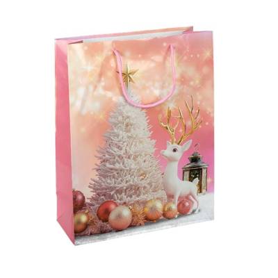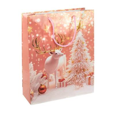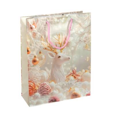 Подарунковий пакет новорічної серії розміром 18×21,5×8 см — стильне рішення для святкового пакування невеликих подарунків, солодощів і сувенірів. Виготовлений з щільного ламінованого паперу з глянцевим покриттям, стійким до вологи і пошкоджень. Яскравий дизайн із зимовими та новорічними мотивами створює атмосферу затишку та радості. Зручні шнуркові ручки забезпечують комфорт під час перенесення.